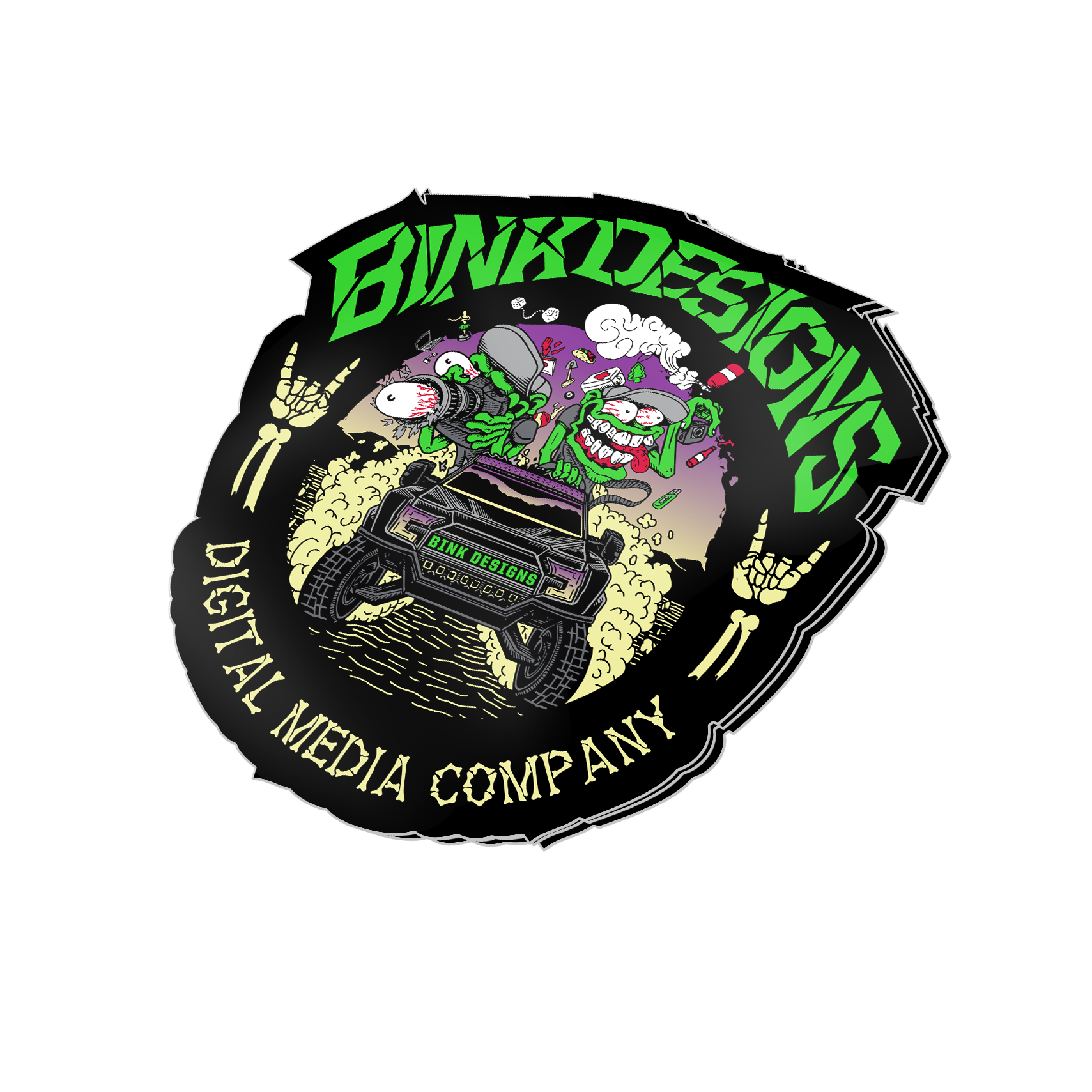 Bink Designs puts a wild twist on the classic Rat Fink style with this playful homage — This 4″ decal featuring our own creation tearing it up in a prerunner truck, capturing media on the go. Complete with fire extinguishers, air fresheners, shovels, and even tacos flying out the back, it’s a chaotic, creative nod to off-road culture and content creation madness.